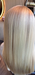 Her på det første bilde har kunden kommet for Keratin-behandling. Forventningen til at resultatet blir supert ved første behandling er høy. Noen ganger må det 2 eller 3 behandlinger til for å få ønsket resultat. Mellom hver av mine behandlinger må kunden selv behandle håret sitt etter anvisning fra meg. Krøllete hår blir etter første behandling mer bølgete. ved andre og 3. behandling vil håret bli rettere og glattere.